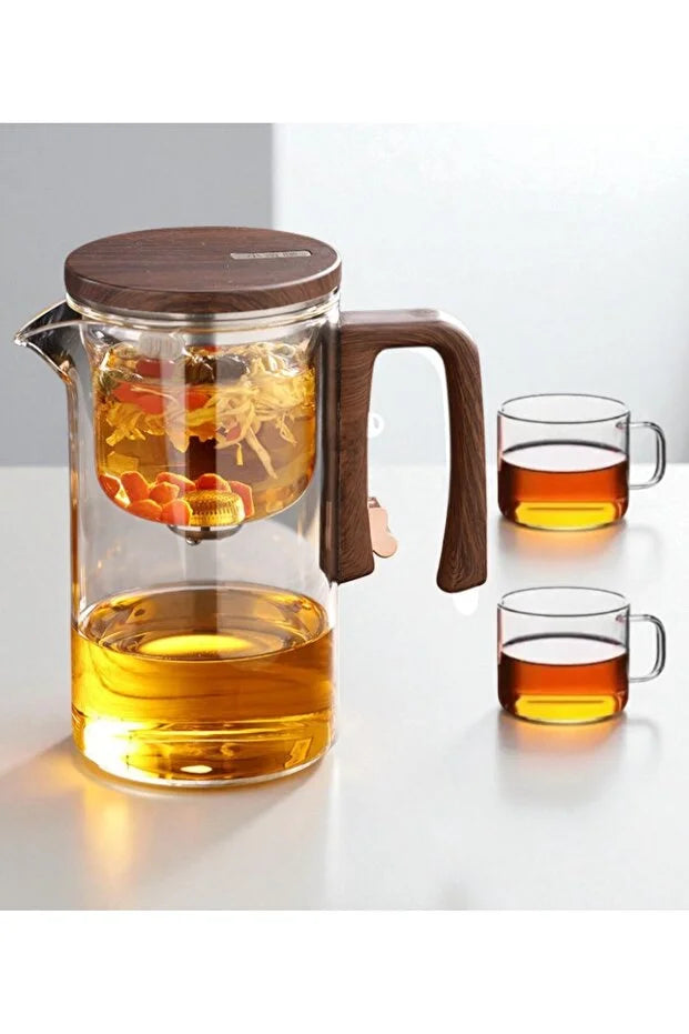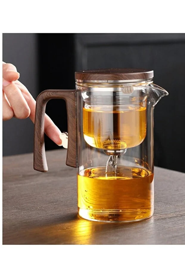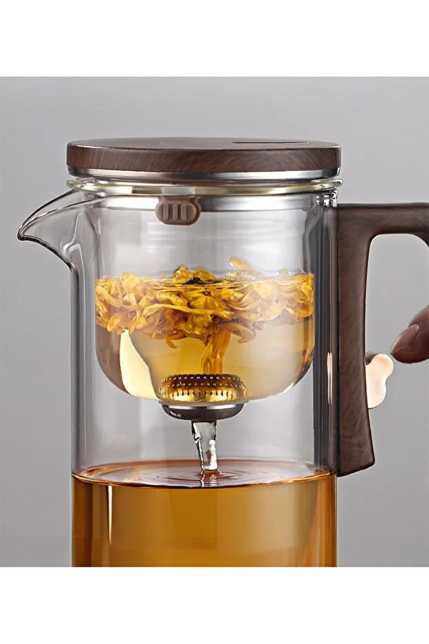 Yandaki düğmeye bastığında, demlenen çay süzgeçten geçip alt hazneye akar 🌿